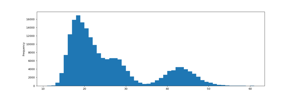 Even under these more difficult conditions, out of 200’000 simulated projects following the changed strategy, not a single one failed to deliver. The following histogram shows the frequency of each number of iterations used across all simulation runs. The slowest occurrence was completed after 61 iterations.