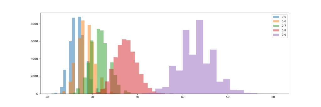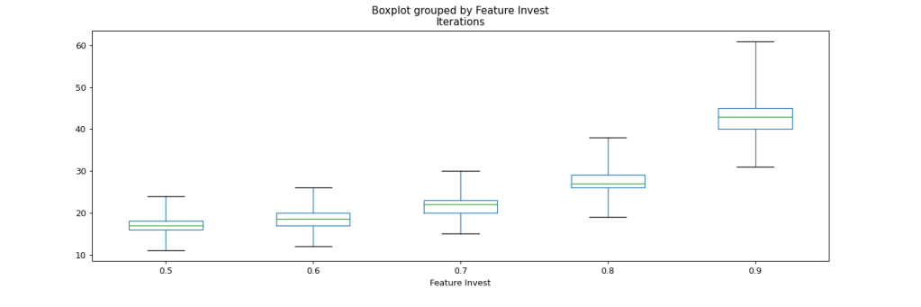 If we dig a bit deeper into how the number of required iterations is distributed, we find that we have a pretty consistent picture now. We still see the resemblance to a power-law distribution in the following box-plot chart, with higher shares of resources invested into feature development leading to longer development times. Note that in contrast to similar charts in the previous simulation, the max here is 61, not 100 iterations.